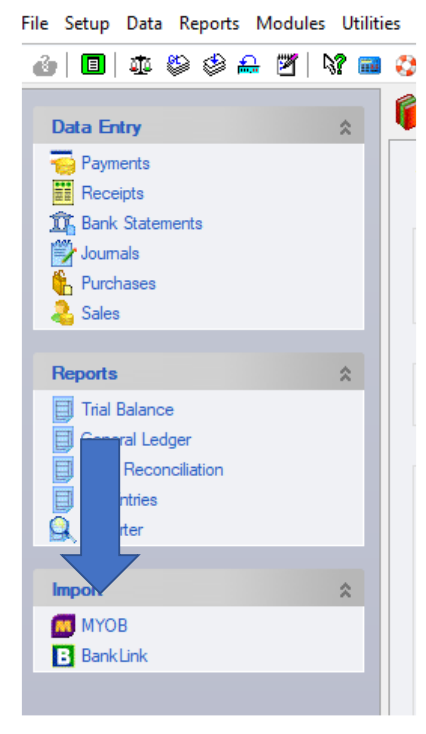 Open the MAS ledger for your client and follow the menu path Utilities > Import > BankLink Transactions or select BankLink from the Import menu.