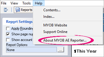 From within Reporter, click the Help menu and choose About MYOB AE Reporter...