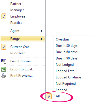 Right-click anywhere within the Tax Returns Due for Lodgment tab and from the drop down menu, choose Range > All.