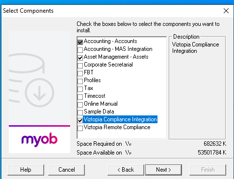 Browse to M:\myob\bin\regiser.bat and Register the modules Accounts, Assets and Viztopia Compliance Integration, contact MYOB support for assistance to update the license using the internal tool.