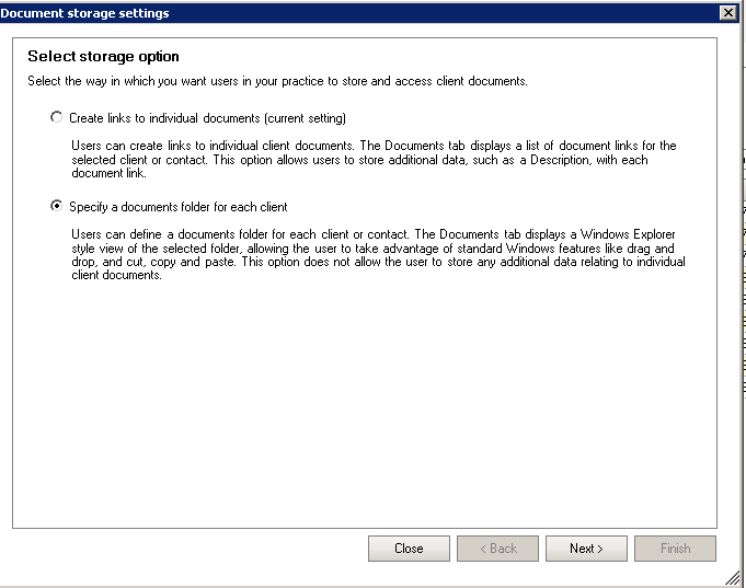 This option is configured as a practice-wide setting and it enables users to specify a document folder for each client, contact and supplier.