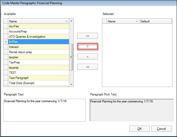 Once the Master Paragraph text has been linked to the Task Codes, when you create your next bill with the Group by Code selection in Stage Three of the Billing Wizard, the text will automatically prefill the screen based on the Task codes you have billed in Stage Two of the Billing Wizard.