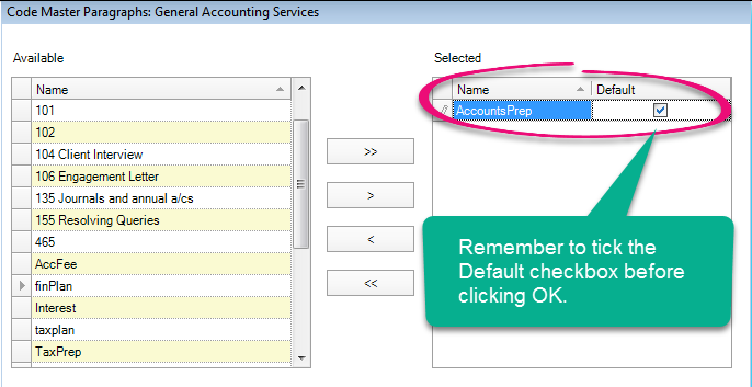 To have the default text appear when billing, you need to create a Master Paragraph with the required text. Then link the Master Paragraph to Task Codes so that default text will display in Stage Three.