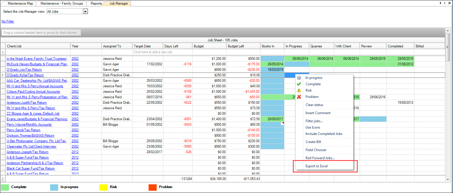 In the Job Sheets homepage within Practice Manager you are able to export the information to MS Excel by right-clicking anywhere on the grid and selecting Export to Excel.