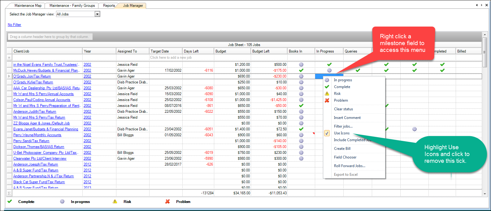 Jobs management reports are also available from the Reports tab of Practice Manager. These reports can be produced to measure actual amounts against budgeted amounts and are generally used when you want to include data from Client Extra fields in your report. See Job management reporting area and Job management reporting for information.