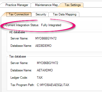 Your AE/AO Practice Manager database has been configured correctly to the AE/AO Tax database: