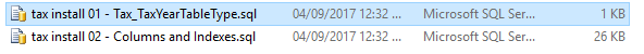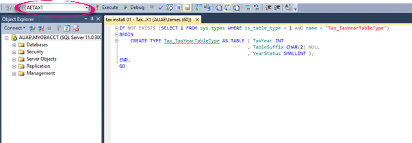Double click tax install 01 – Tax_TaxYearTableType.sql. You will see the query displayed in SQL Management Studio.