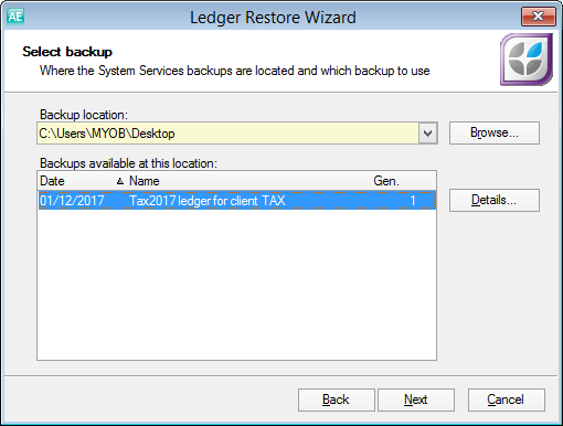 Select the name of the ledger you wish to restore, then click Next.