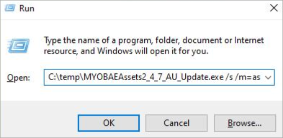 In the Open field, browse to the location identified at Step 1 and then type MYOBAEAssets2_4_7_AU_Update.exe /s /m=assets_silent.inf. Then click OK. The silent installation begins. For example, where C:\temp is where you've saved the file.