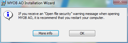 During installation if the message ‘If you receive an “Open file security” warning message when opening MYOB AO, it is recommended that you restart your computer’ appears, click OK.