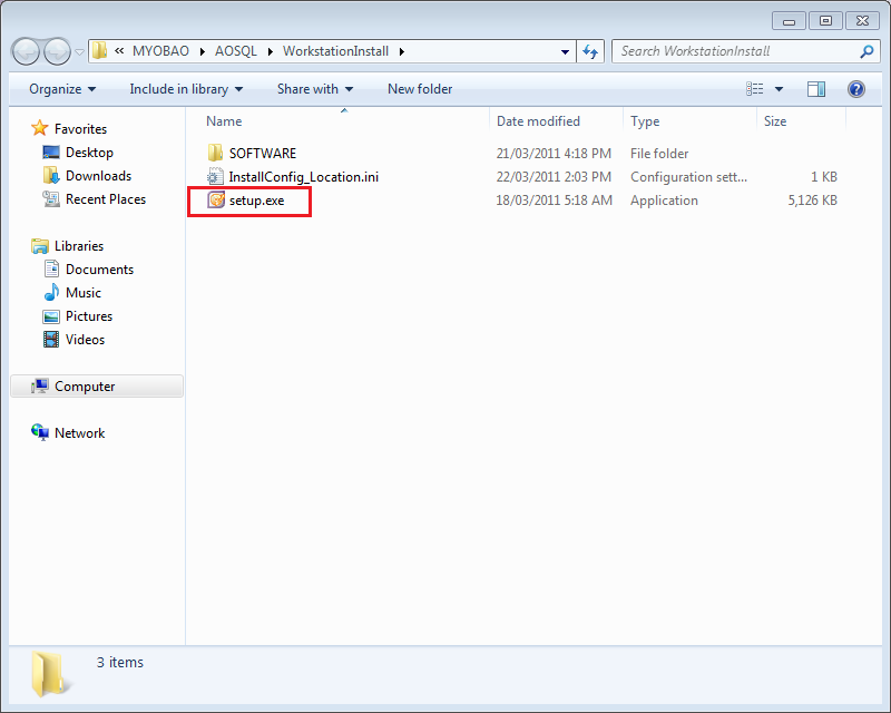 Open Windows Explorer and navigate to: \\servername\MYOBAO\AOSQL\WorkstationInstall, where: servername is the name of the server or computer on which you performed the server installation.