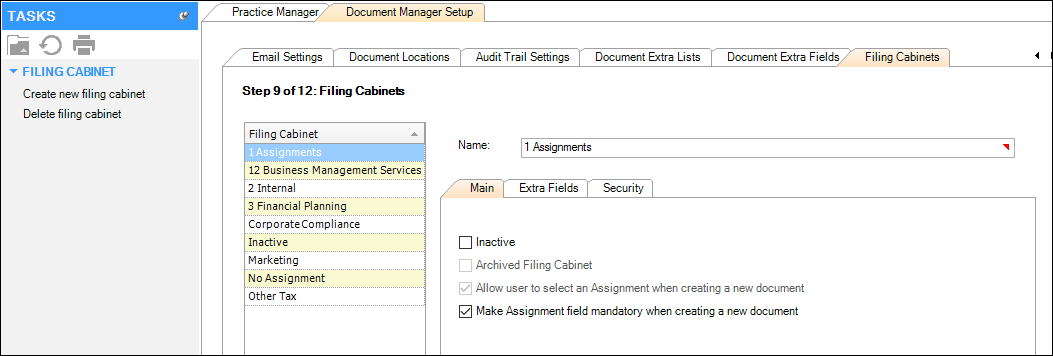 Highlight the required Filing Cabinet. The Main, Extra Fields and Security tabs for that Filing Cabinet display.