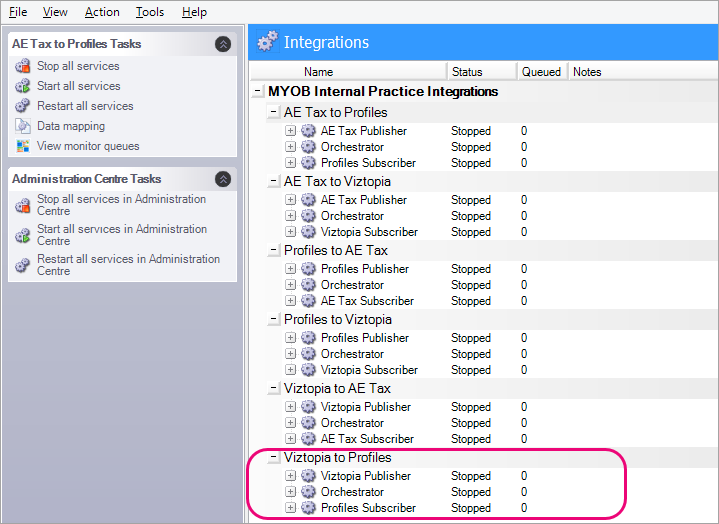 Click Stop all services on the sidebar. The status of all services show Stopped.