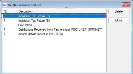 Delete the line with No with 0 and Description - Individual tax return(EI). If you can't find the line with 0 in the delete schedule window, contact Support.