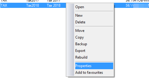 Right-click the affected tax year's ledger and select Properties. The Item properties window appears. Example: Right click on Tax 2013 and select the option Properties.