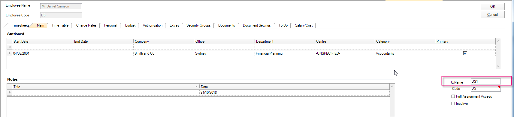 If you use AE Series 6/8 and changed the Windows login name of the employee make sure to change the U/Name field in the Employee details.