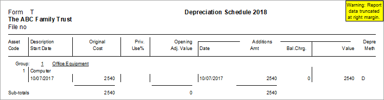 The warning advises that the document you're previewing has been truncated. This can occur if the document doesn't fit on the page setup allocated to that particular schedule or worksheet (see example below).