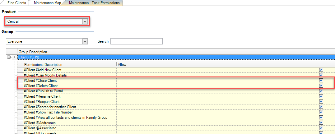 before the Client to expand. - Tick the Allow checkbox against #Client #Close Client and #Client #Delete Client and click OK.