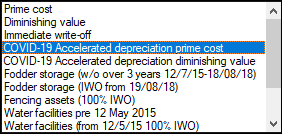 In the depreciation worksheet (d), we've added 2 new COVID-19 depreciation method codes for prime cost and diminishing value.