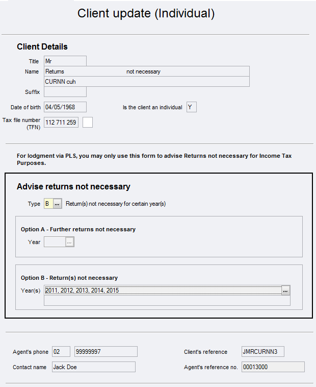 Although the ATO has named this schedule Returns not necessary, this form covers both Further returns not necessary and Returns not necessary for more than one year. This has completely changed functionality from what was specified for ELS. Using these new forms, you can: