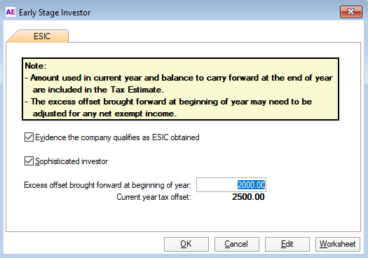 The Evidence the company qualifies as ESIC obtained question is mandatory. Click the Sophisticated investor checkbox if investor has passed the sophisticated investor test for at least one of the acquisitions. Enter any Excess offset brought forward from the previous year, adjusting the excess to take account of any net exempt income under Div 65 of the ITAA 1997.