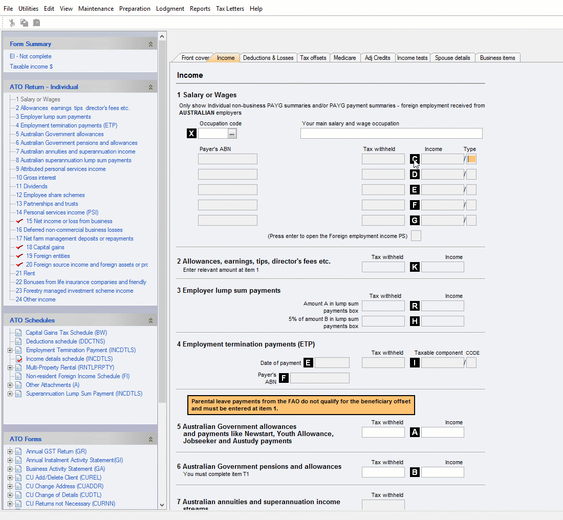 In an individual return, most income items now have a new or revised worksheet. You need to use the worksheets to enter income into those items. You can no longer enter the amounts directly into these labels.