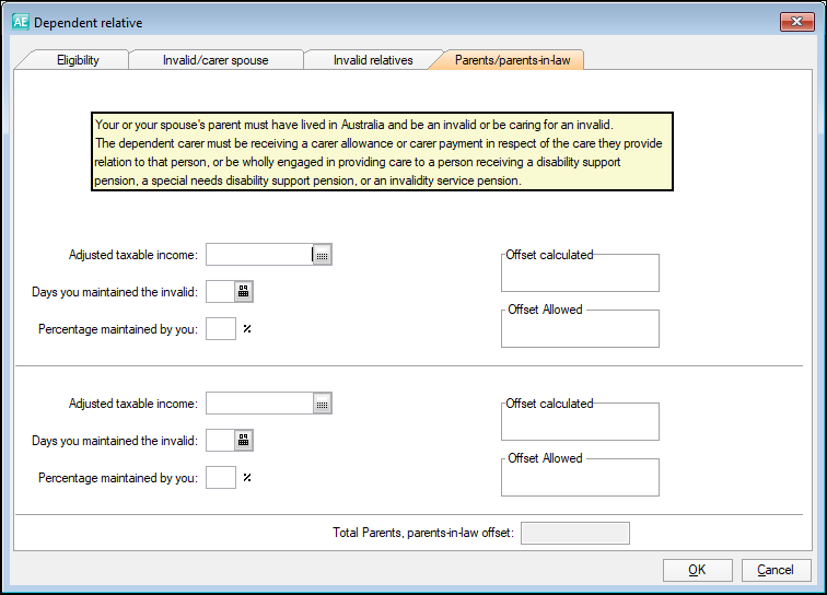These offsets are claimed in the Invalid and carer worksheet opened from T6. Choose the offset being claimed by clicking the tab on the title bar. The 3 available offsets: