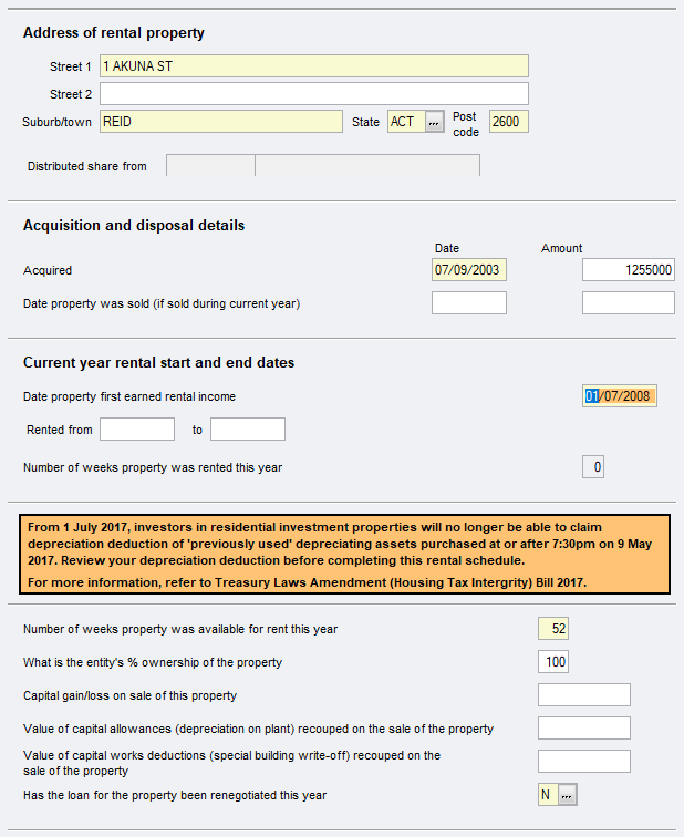 • a zero is pre-filled at the Number of weeks property was rented this year field, and