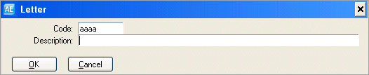 Code: There are up to ten alphanumeric characters available in this field. Key a code with which to index the letter layout. All letters are listed in alphabetical order according to the code that has been entered in this field. Description: There are up to forty alphanumeric characters available in this field. Key a meaningful description for the letter layout, for example, 'Label page definition'.
