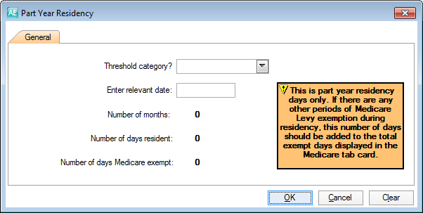 This dialog is used to record the date at which the taxpayer's residency in Australia commenced or ceased. Part year residency affects the tax free threshold.