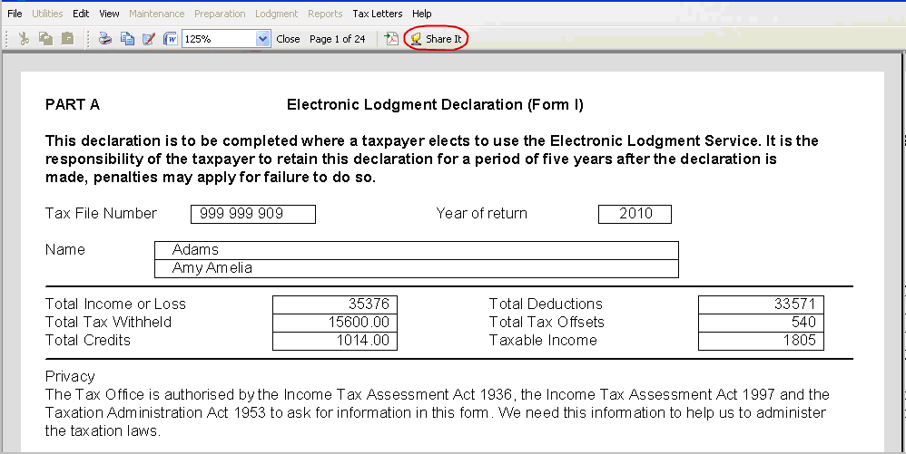 The Print Preview toolbar provides the Share It button when Practice Manager installed. This function allows users to profile tax returns to the client’s Document tab in Practice Manager. When Share It is selected the Create Document Wizard opens with the Client Code and document Title pre-filled.