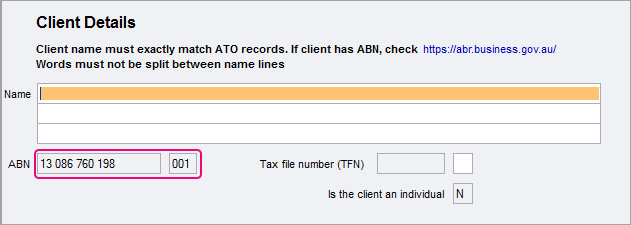 To enter the ABN, go to Return properties > General tab, and enter a value in the ABN and Division No field. (Division No is also known as Branch code, with values 001 to 999).