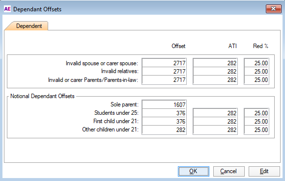 The Dependency Tax Offsets dialog is opened from the Individual return at item T4, or T6 or by selecting the worksheet from Preparation > Schedule > (shz) Invalid or carer, Zone offsets.