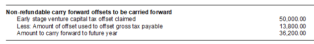 Any share of ESVCLP tax offset received will be added to the esv worksheet with the Code D and will be included in the total offset to be claimed at Item 22: Early stage venture capital limited partnership tax offset—label L, and is then passed to the Calculation statement: Non-refundable carry forward tax offsets worksheet (ncf) at label D. See Non-Refundable carry forward tax offsets worksheet (ncf) 2023