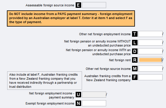 Although the foreign rental worksheet is a separate worksheet, for calculation purposes only, it is controlled by the foreign income worksheet (for). Therefore when you want to open it, click label R in the Individual Return at item 20 as shown below:
