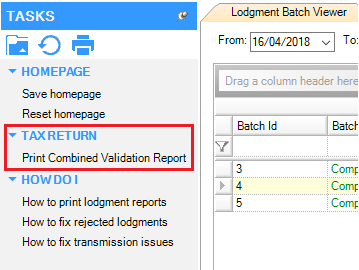 You can print a combined validation report for each lodgment (batch) – select Tasks > Tax Return > Print combined validation report.