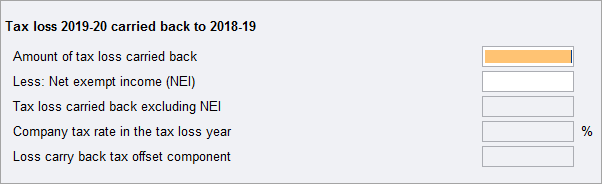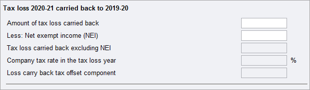 If you have a tax loss in the income year 2019-2020, you can carry it back to tax loss year 2018-2019. Complete the first section (Tax loss 2019-20 carried back to 2018-19). The third component will be disabled.