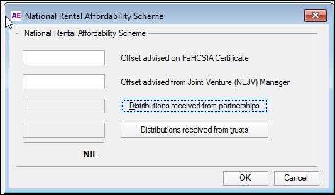 A holding dialog is provided at the relevant NRAS items in the Company, Fund, Self-Managed Fund, Trust and Partnership returns as detailed below. Distributions to individuals are entered in the Distributions from Partnerships worksheet (dip) and Distributions received from Trusts worksheet (dit).