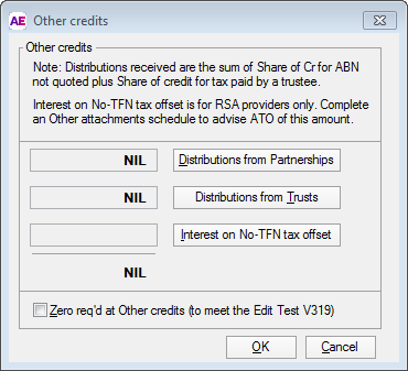 Because the amount to be entered at label H7 can be integrated from the Partnership distribution and/or the Trust distribution sections of the Distribution from Partnerships (dip) and Trusts worksheet (dit), or from the Interest on no-TFN tax offset worksheet (ito) a holding dialog has been provided at this label.