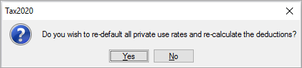 | Default private use % | Enter the private use % and click Yes if you want to default this rate for all the expenses. You can manually overwrite any expenses if the private use % is different. Use Private amount field to overwrite any amounts. |