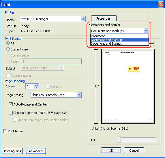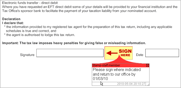 Adding Mark-up to a tax return before emailing it to a client or saving it to MYOB Document Manager. For example, the Mark-up image may state, Sign Here.
