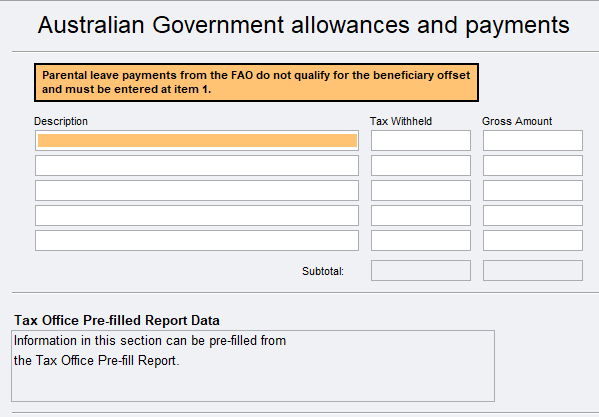 - Don't enter parental leave and/or dad and partner payments received from the Family Assistance Office (FAO) here. Enter them at item 1: Salary or wages as those payments don't qualify for the beneficiary tax offset.