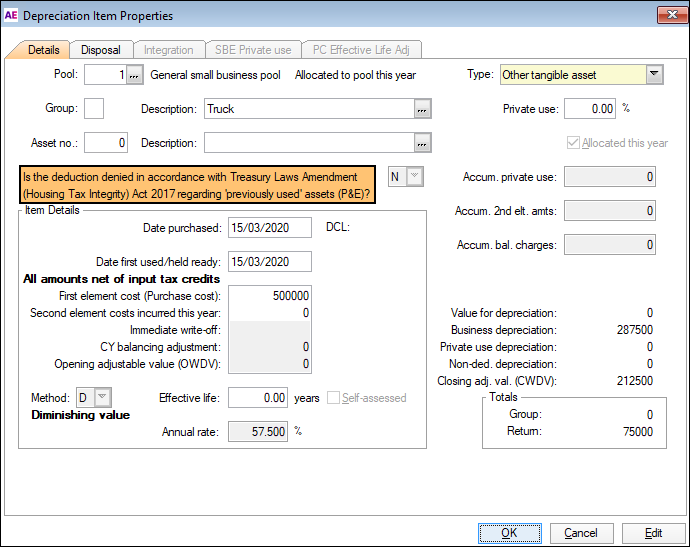 In the depreciation worksheet (d), we've added 2 new COVID-19 depreciation method codes for prime cost and diminishing value.