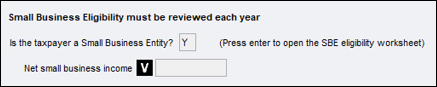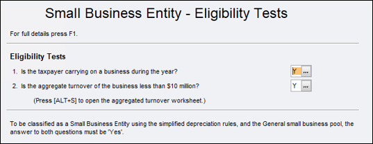 To qualify for the depreciation, you must answer Y to Eligibility tests questions 1 and 2 in the Small business entity - eligibility tests worksheet.