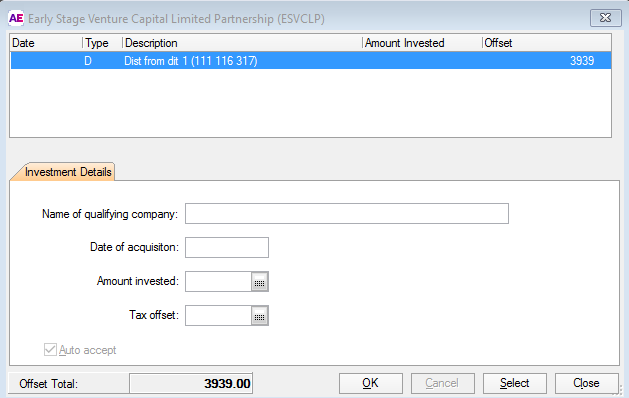 1. Once you have recorded the share of ESVCLP tax offset received in the Distributions from partnerships (dip) or the distributions from trusts (dit) worksheets have been completed at item 13: Partnerships and trusts—label O or U, you will see the effects of this in the ESVCLP worksheet (esv) at item T8.
