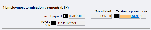If you've received only one ETP payment during the current income year, the ATO only wants to receive the values from the return labels. See Item 4 - Employment termination payments (ETP) 2023.