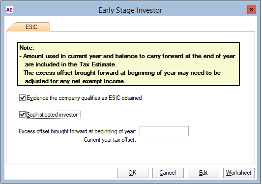 The Evidence the company qualifies as ESIC obtainedcheckbox is mandatory and the Sophisticated investor checkbox must be ticked if an offset is to be allowed. You must only tick the Sophisticated investor checkbox if the taxpayer has passed the sophisticated investor test for at least one of the transactions. The Sophisticated investor test does not apply if the company receives a distribution of ESIC ax offset from a partnership or trust.