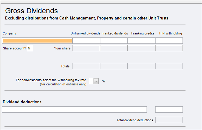 | Franked dividends | This is the amount of the fully franked dividend received (grossed up to include any franking credits attached to it. This field will be disabled if the country of residence is not Australia and one of its territories. |