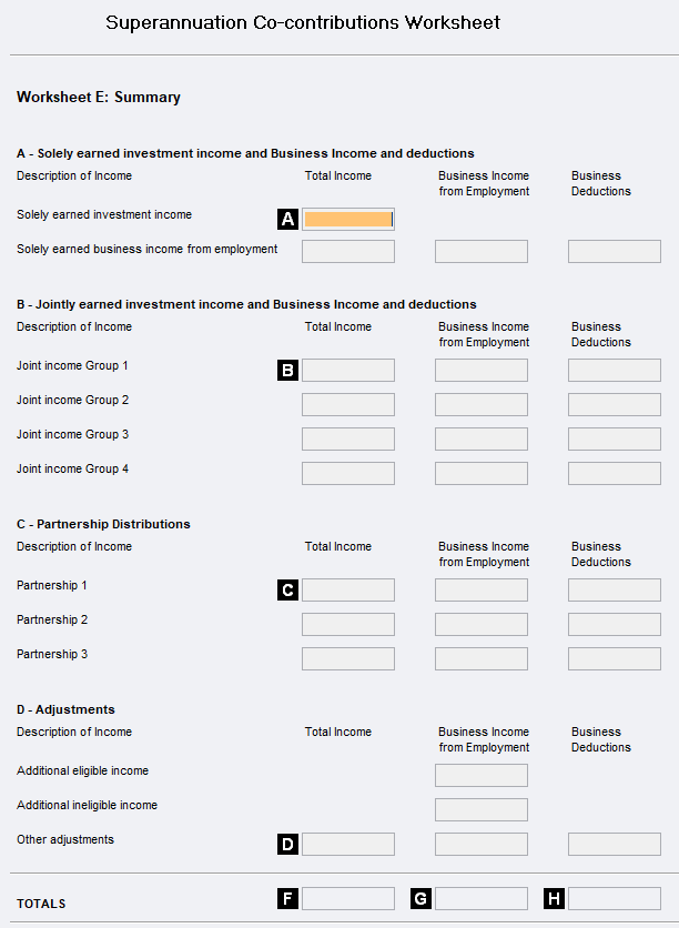 The superannuation co-contributions worksheet is made up of a series of worksheets that feed into a summary worksheet. It is the summary worksheet that integrates calculated values to the labels F, G and H at A3.