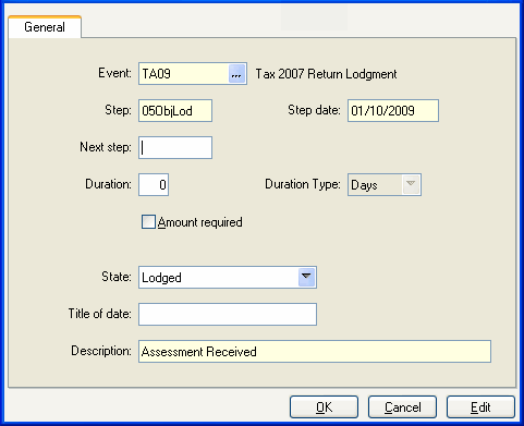 A Step is a task that needs to be completed in sequence for an Event to be complete. The data to be updated is presented on the General Tab.